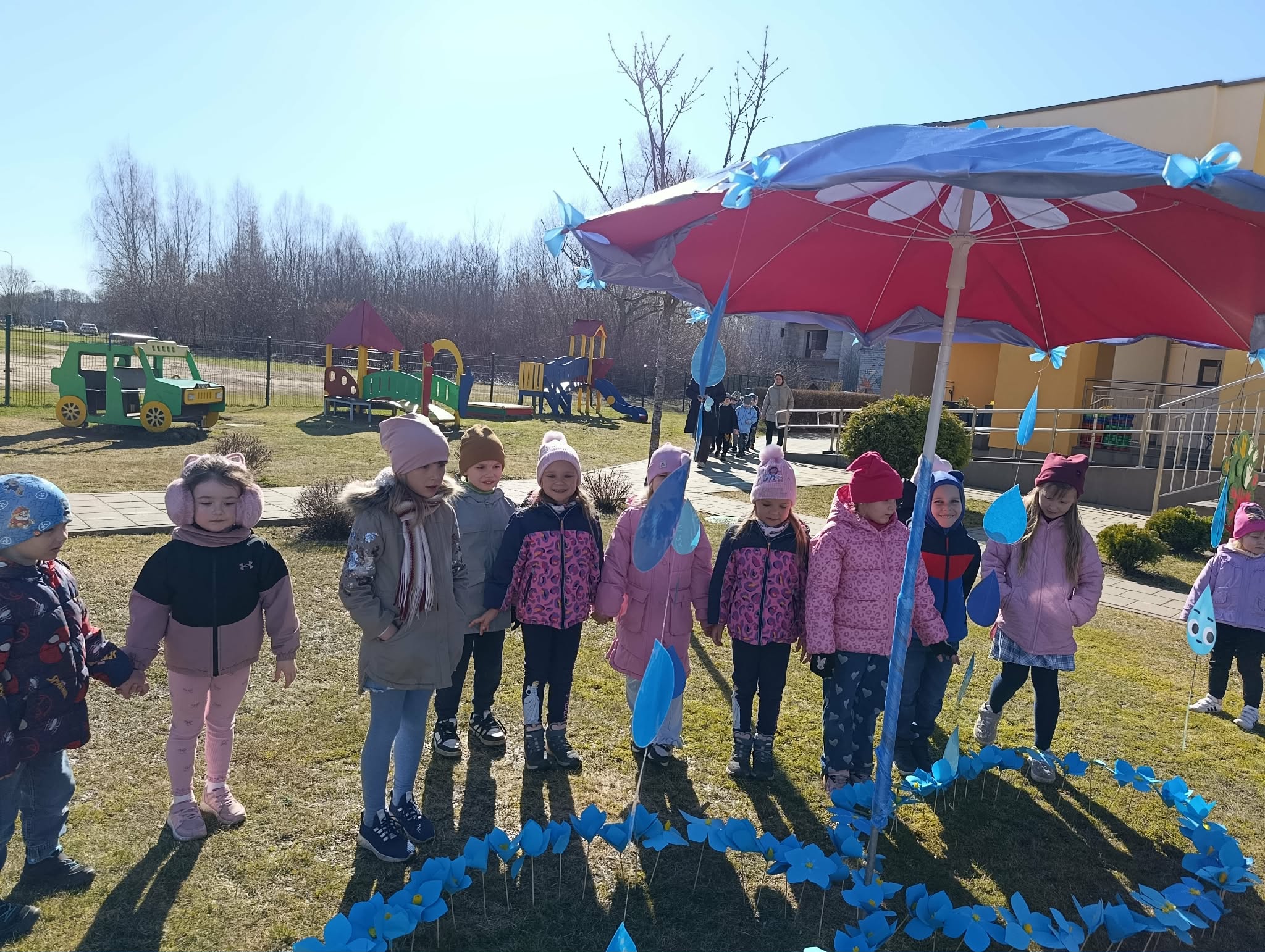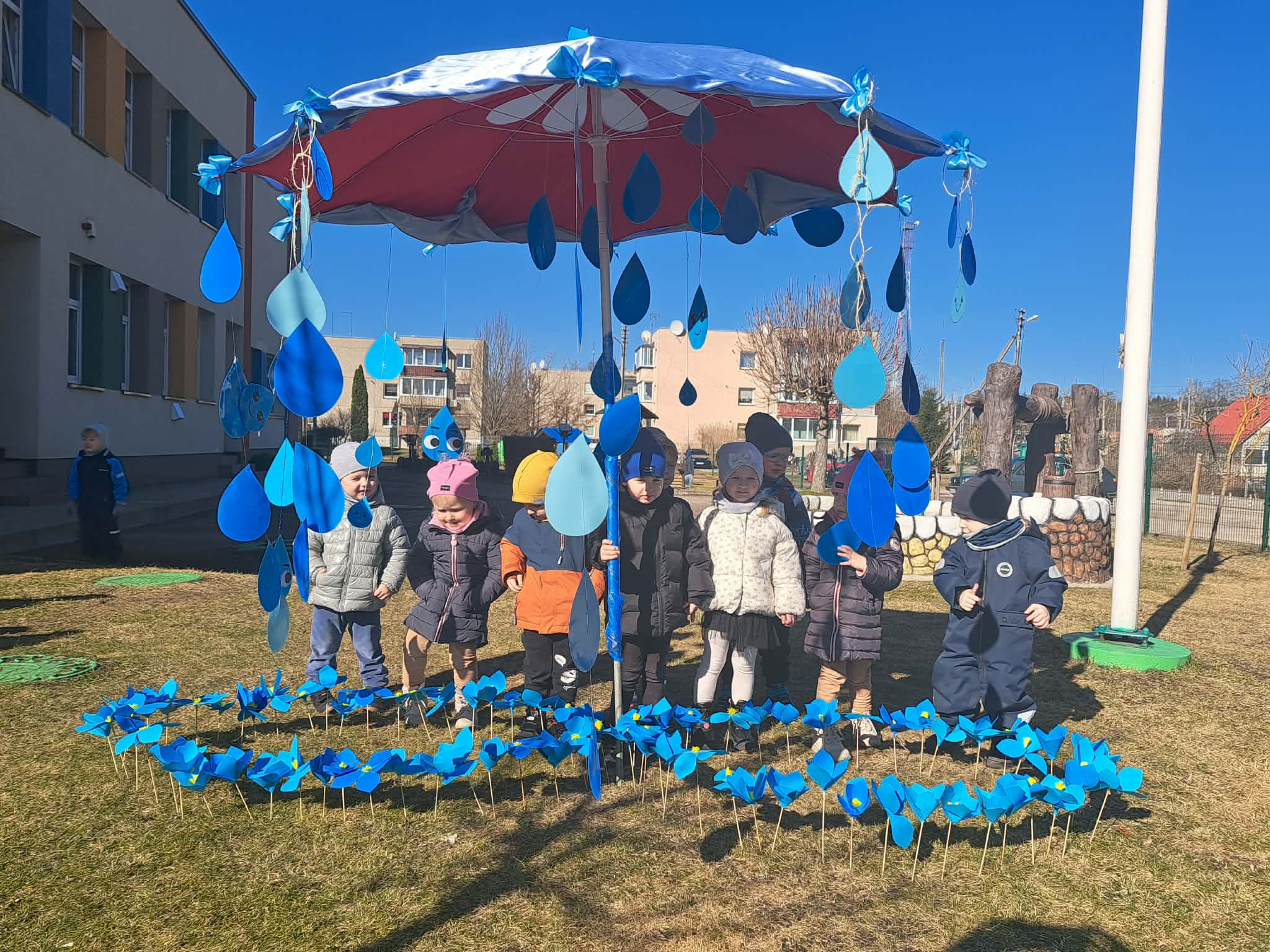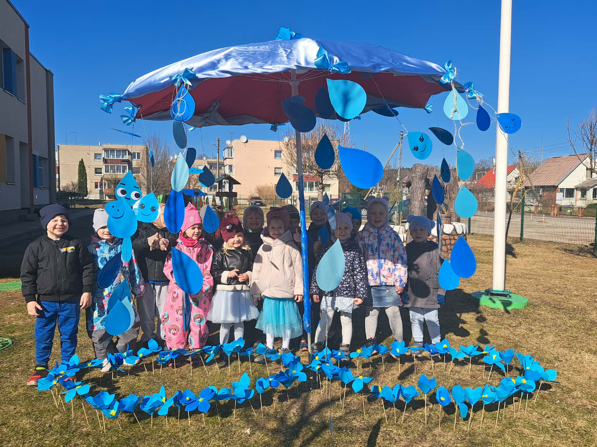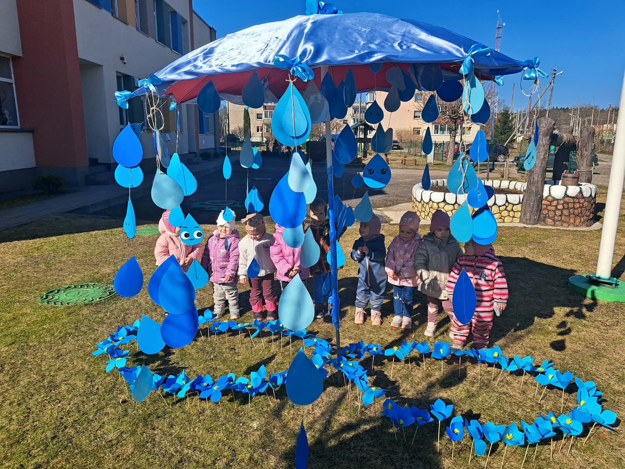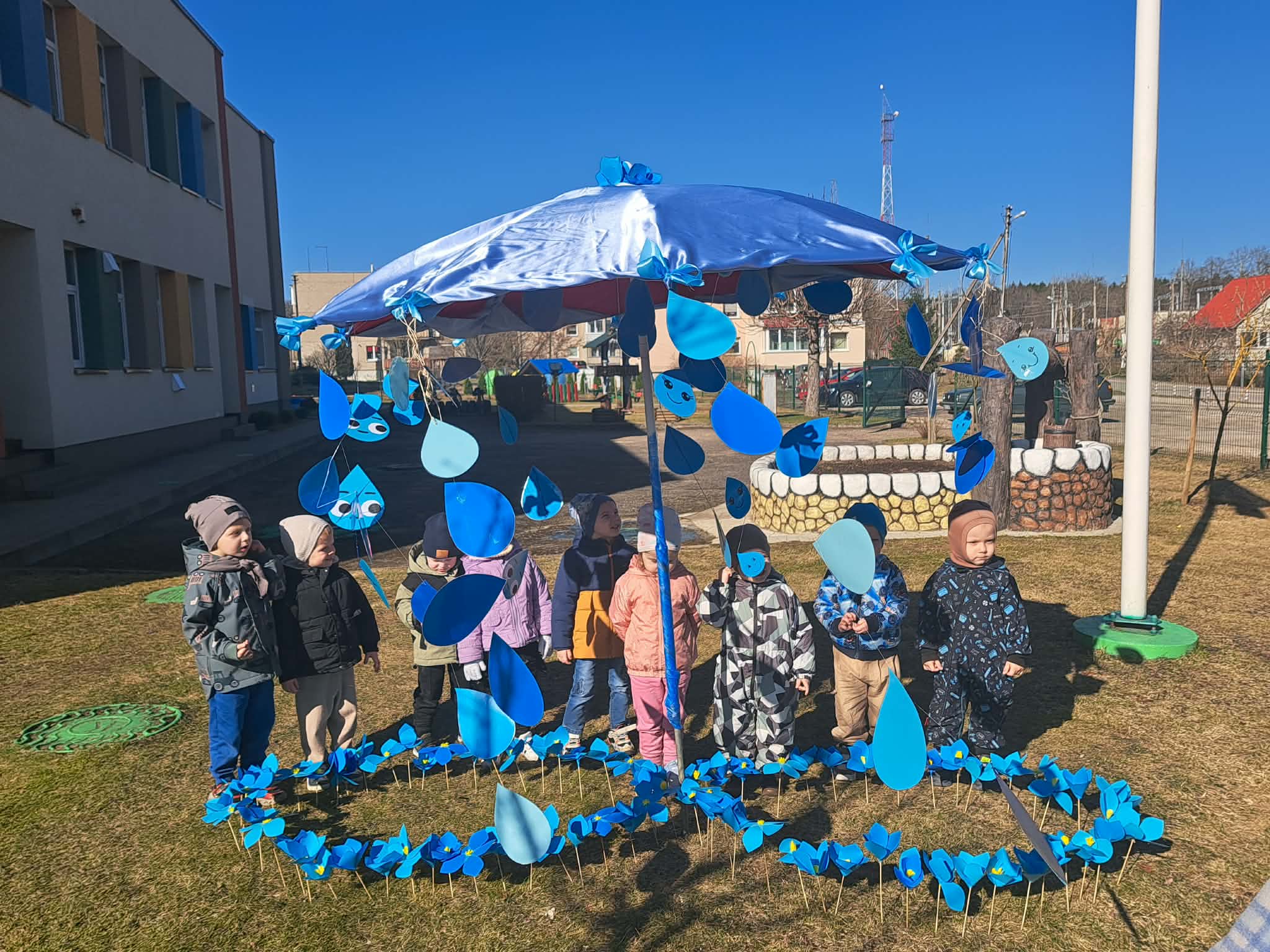 Vėliau visi susirinko lauke bendrai veiklai. Čia vaikų laukė simbolinė užduotis – papuošti skėtį lietaus lašeliais.