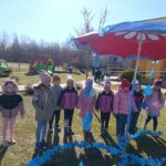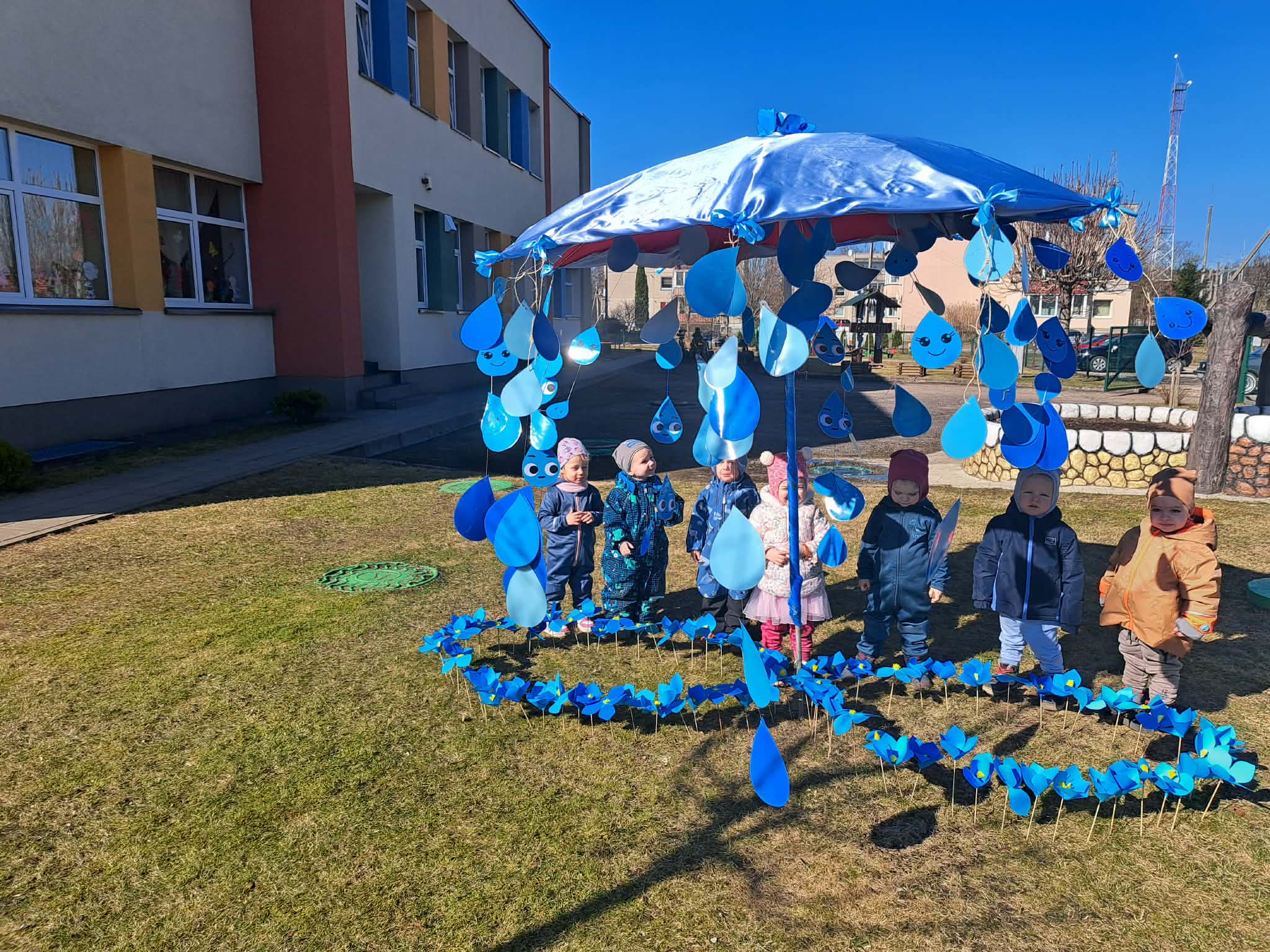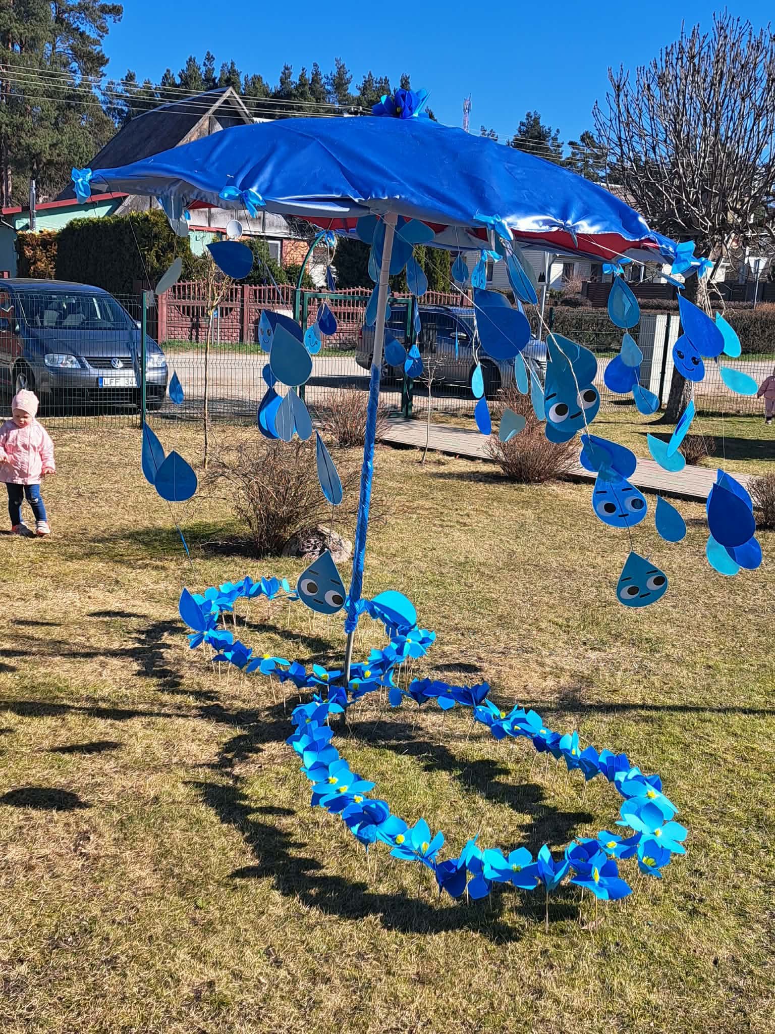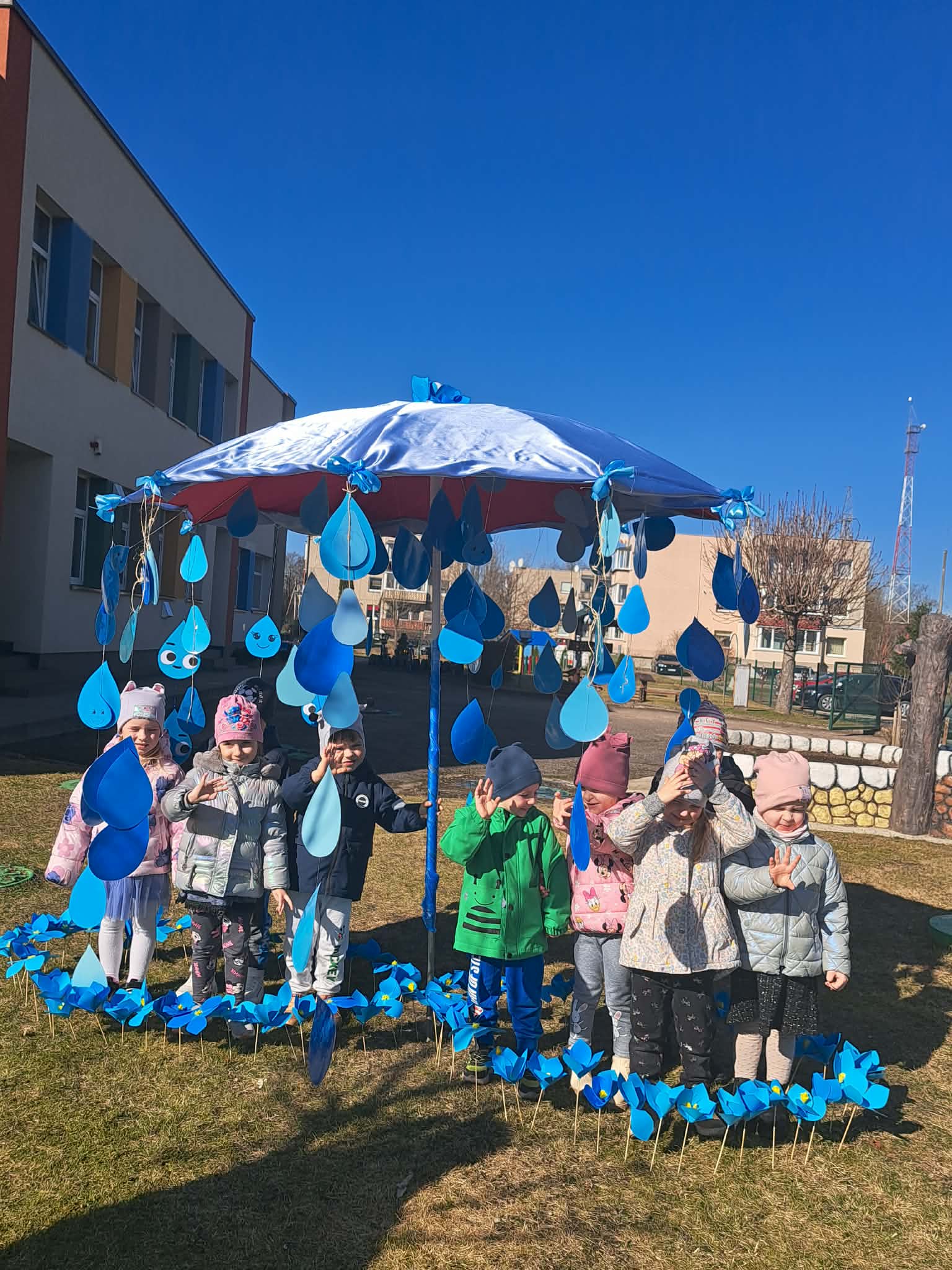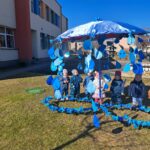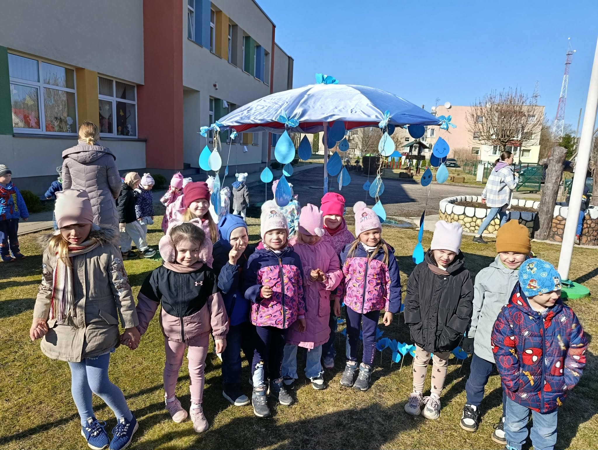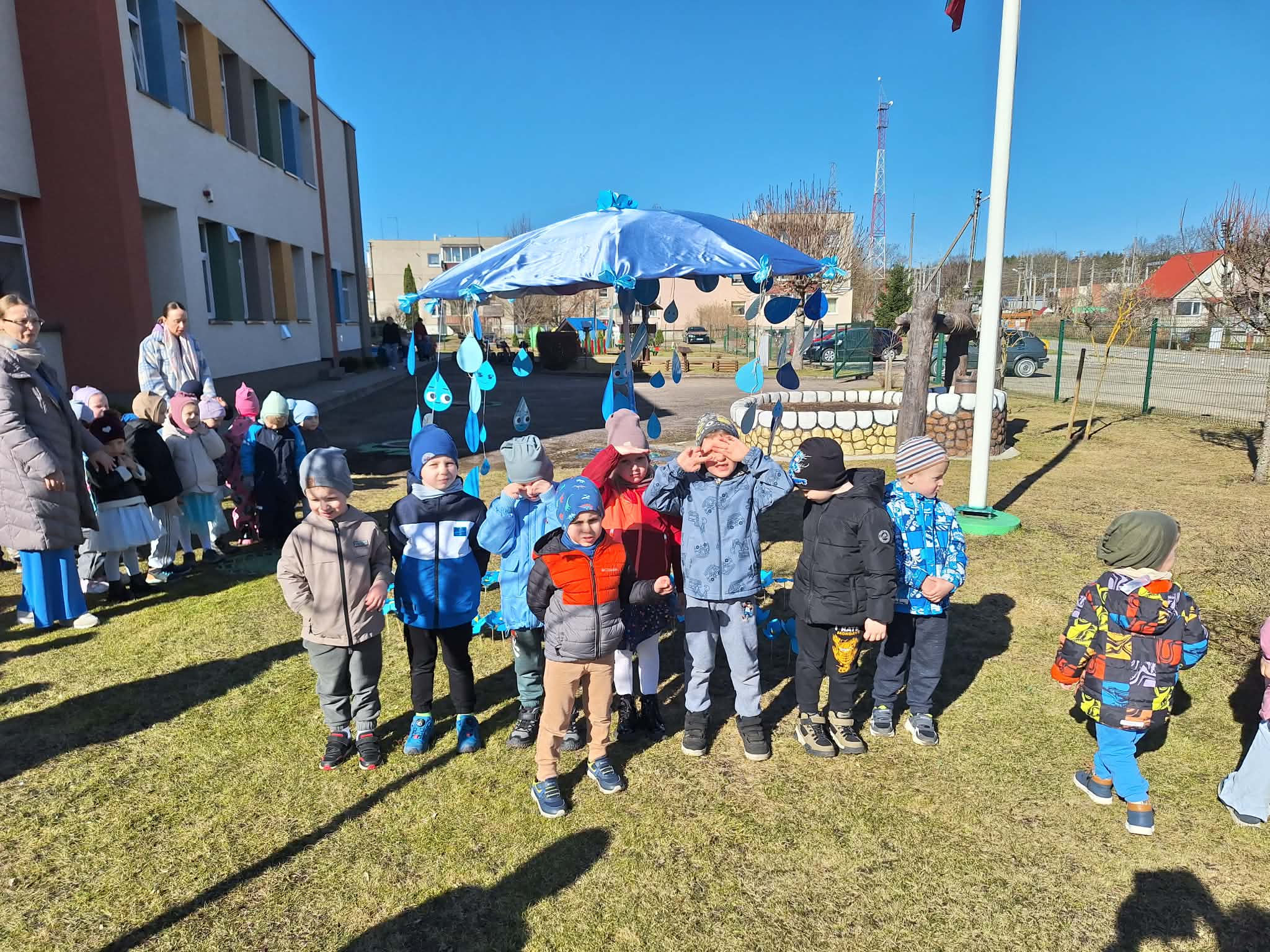 Vėliau visi susirinko lauke bendrai veiklai. Čia vaikų laukė simbolinė užduotis – papuošti skėtį lietaus lašeliais.