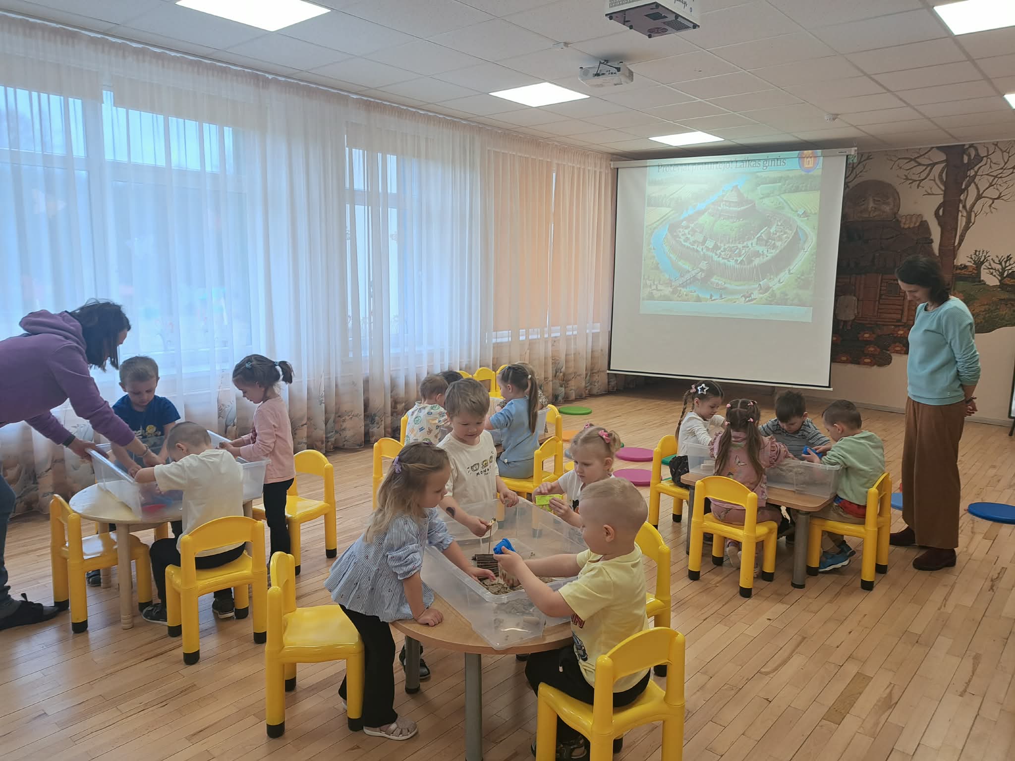 Šiandien mūsų „Pelėdžiukų“, „Zuikučių“, „Bitučių“ ir „Ežiukų“ grupių vaikai kartu su edukatore Enrika leidosi į pažintį su kitokia Lietuva – ta, kurioje kraštovaizdį puošė medinės pilys, o gyvenimas virė piliakalniuose.
