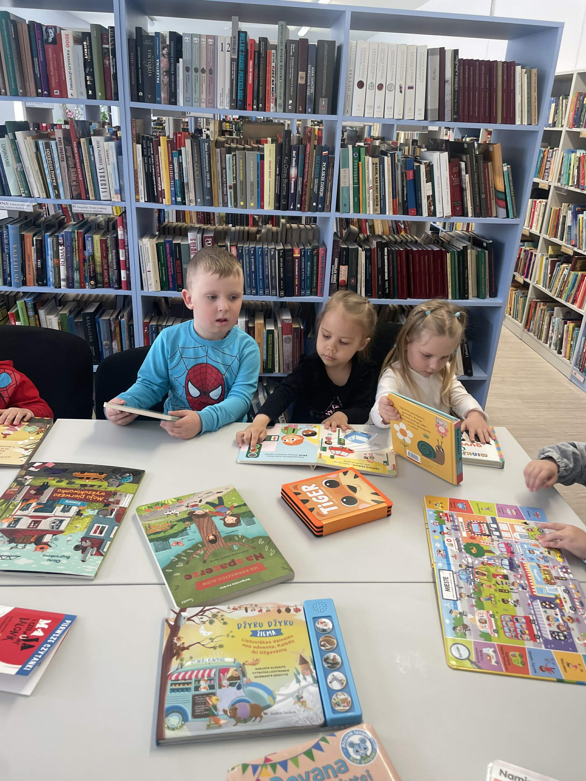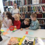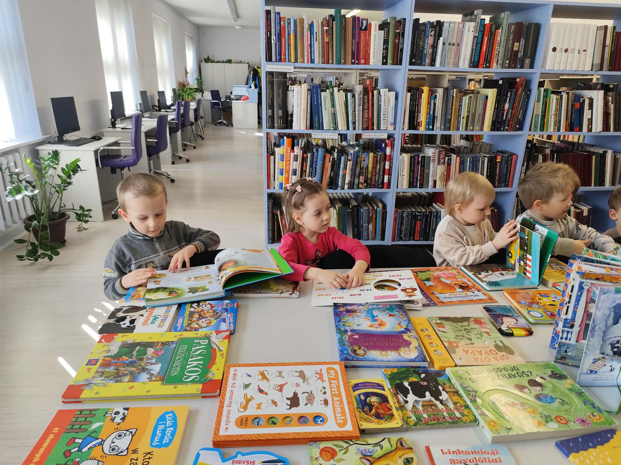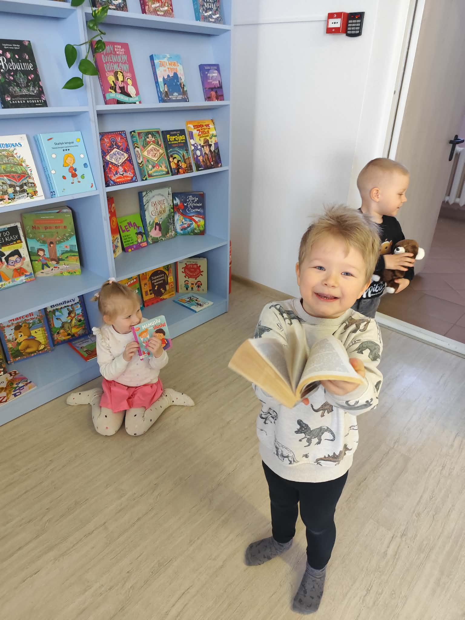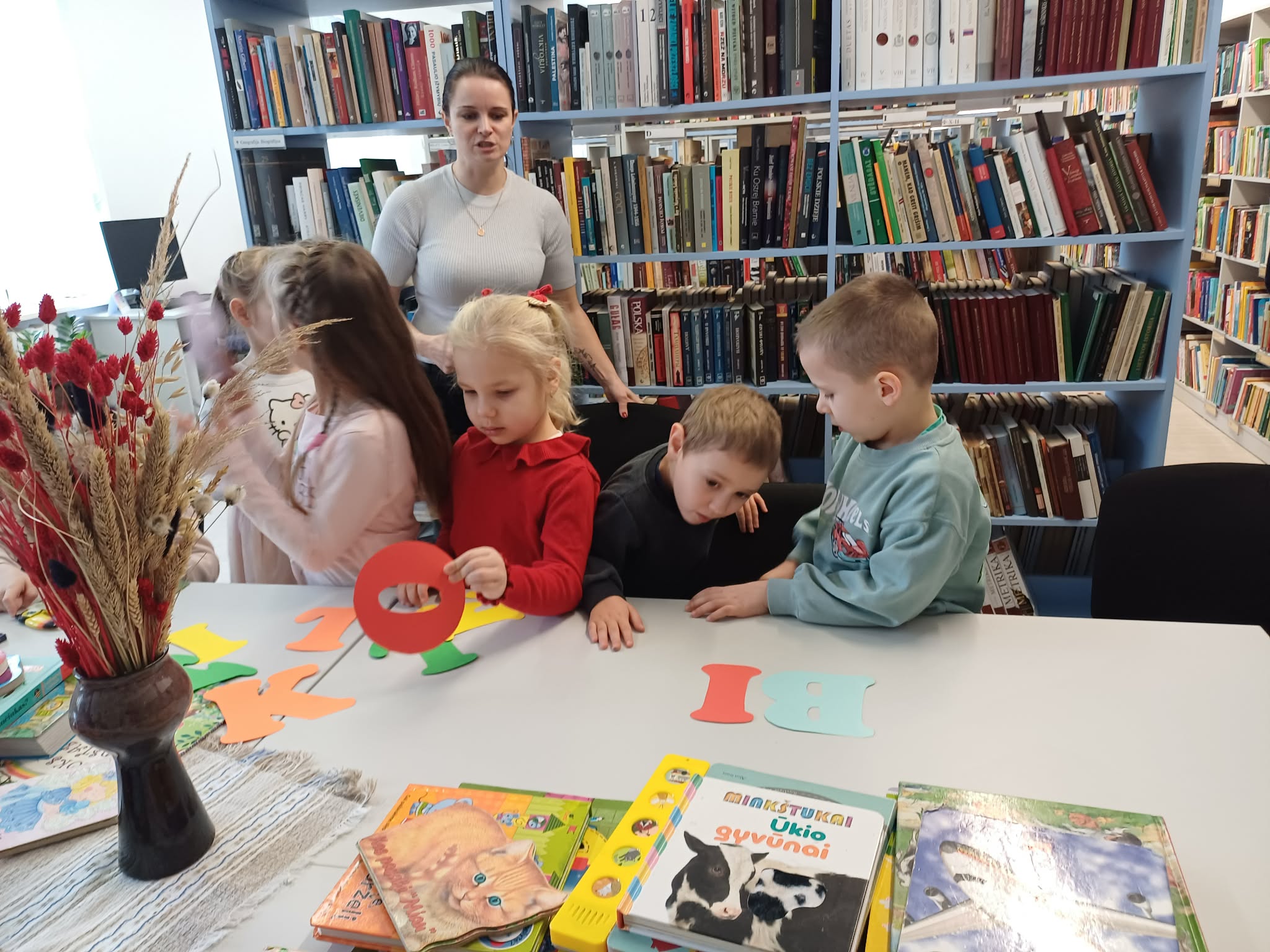 Bibliotekos darbuotoja šiltai priėmė mažuosius lankytojus ir vedė trumpas, įdomias edukacijas. Vaikai vartė įvairias knygeles, kūrė aplikacijas, dalyvavo smagiuose žaidimuose.