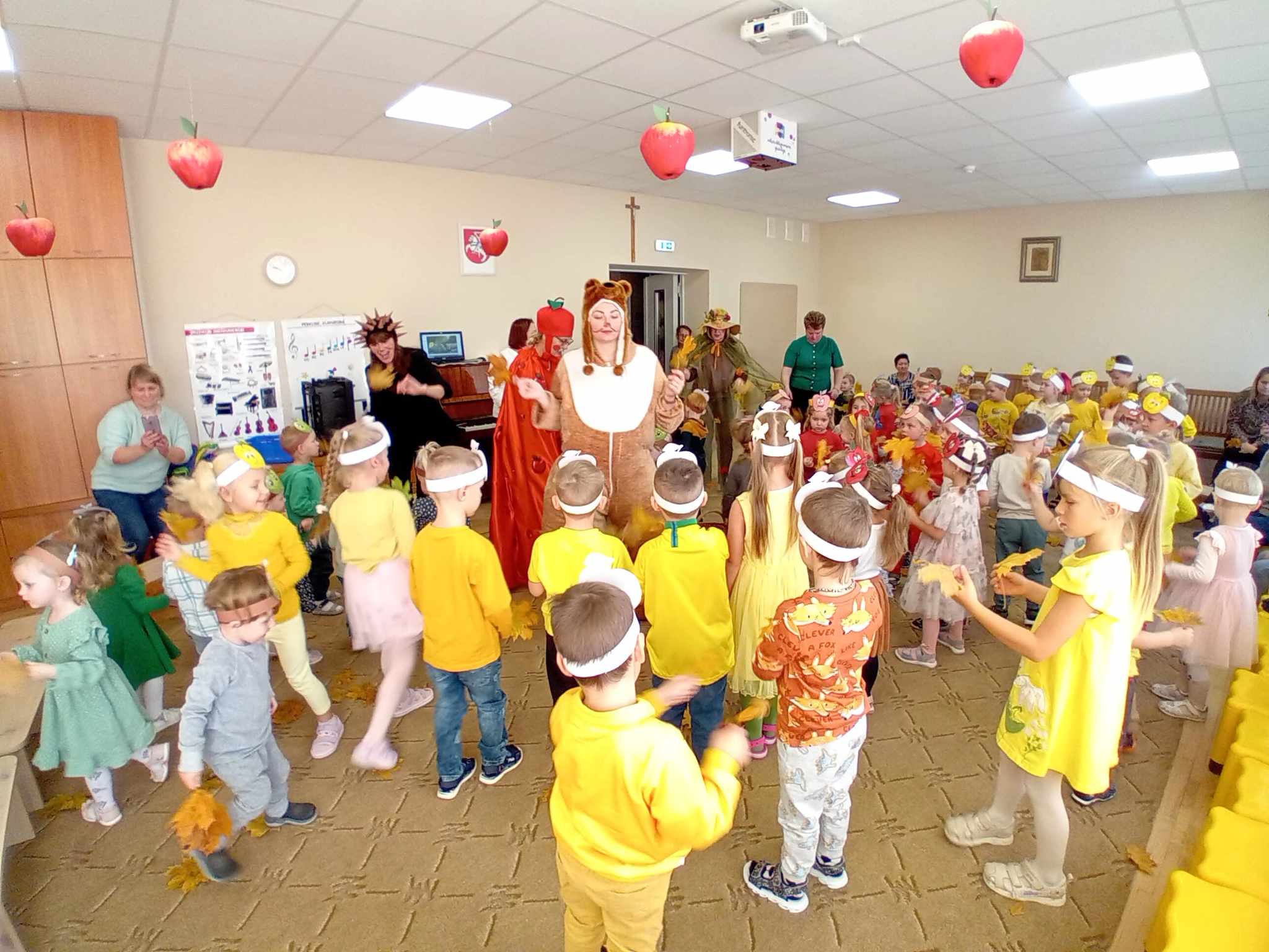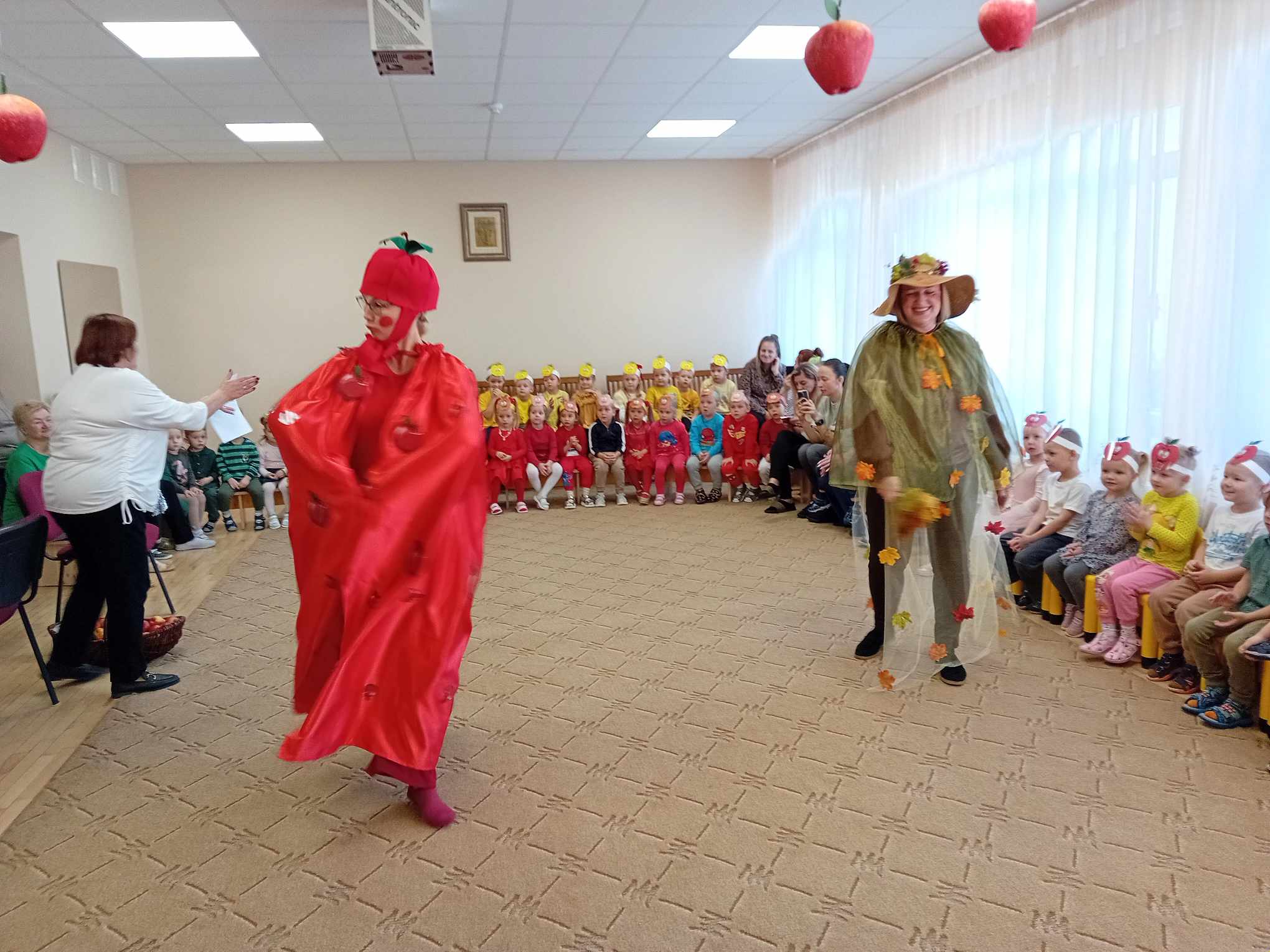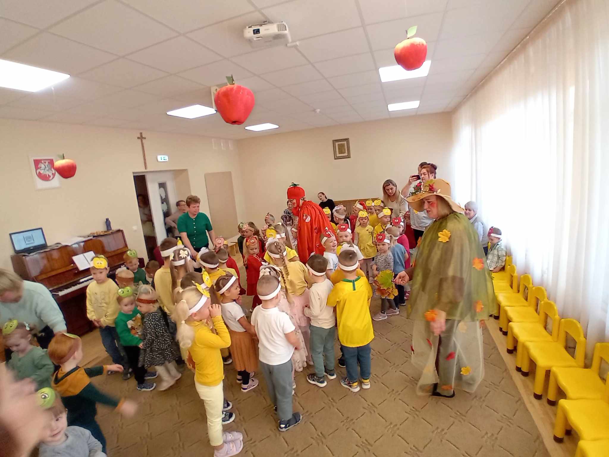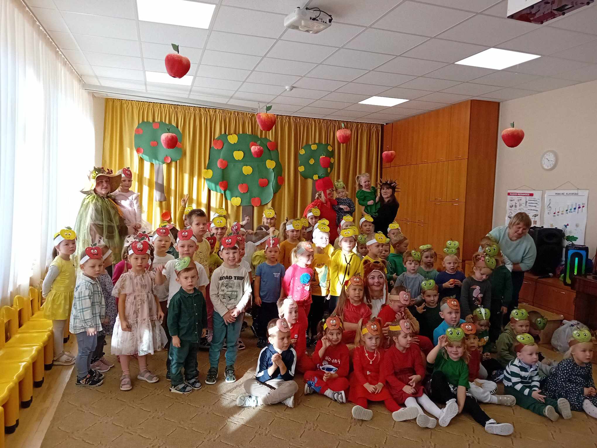 Žaidė įvairius žaidimus su obuoliais.  Jų metu pedagogai stengėsi  praturtinti vaikų žinias apie obuolį, jo populiarumą, turtingumą vitaminais, maistinėmis medžiagomis,  reikšmę žmogaus organizmui, skatino sveikai maitintis valgant kuo daugiau vaisių.