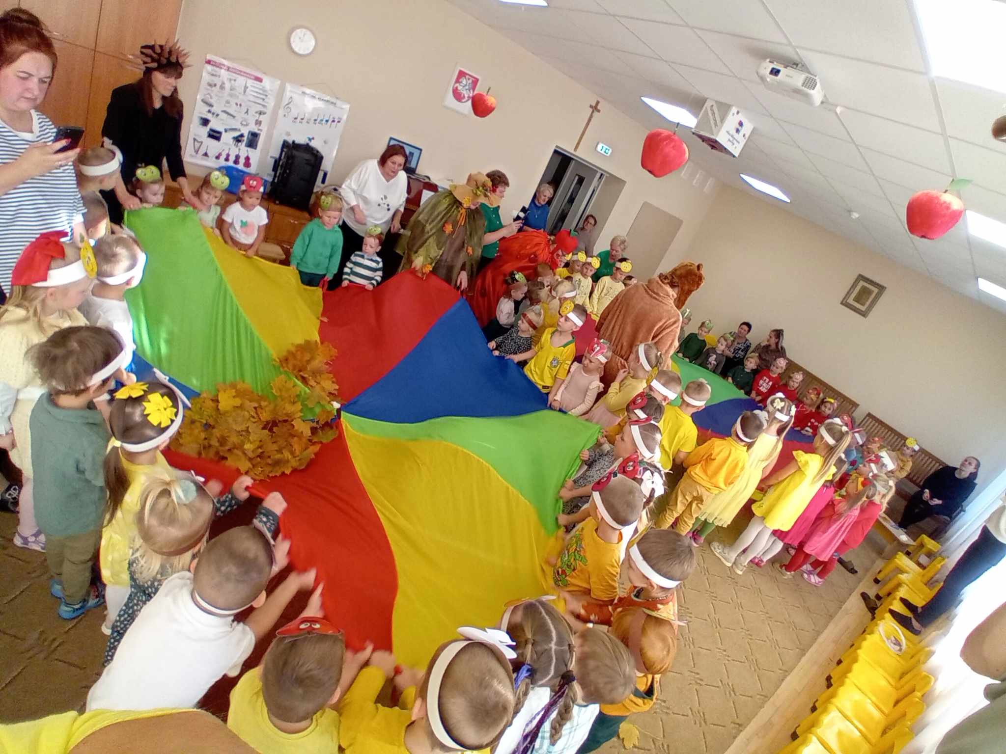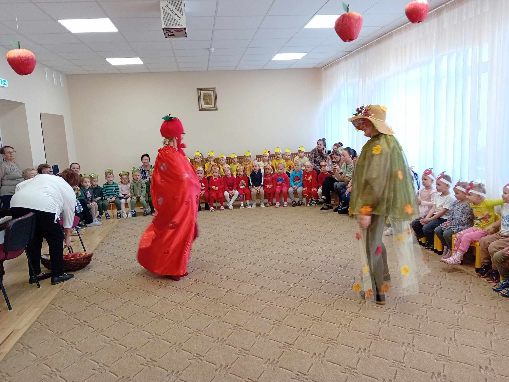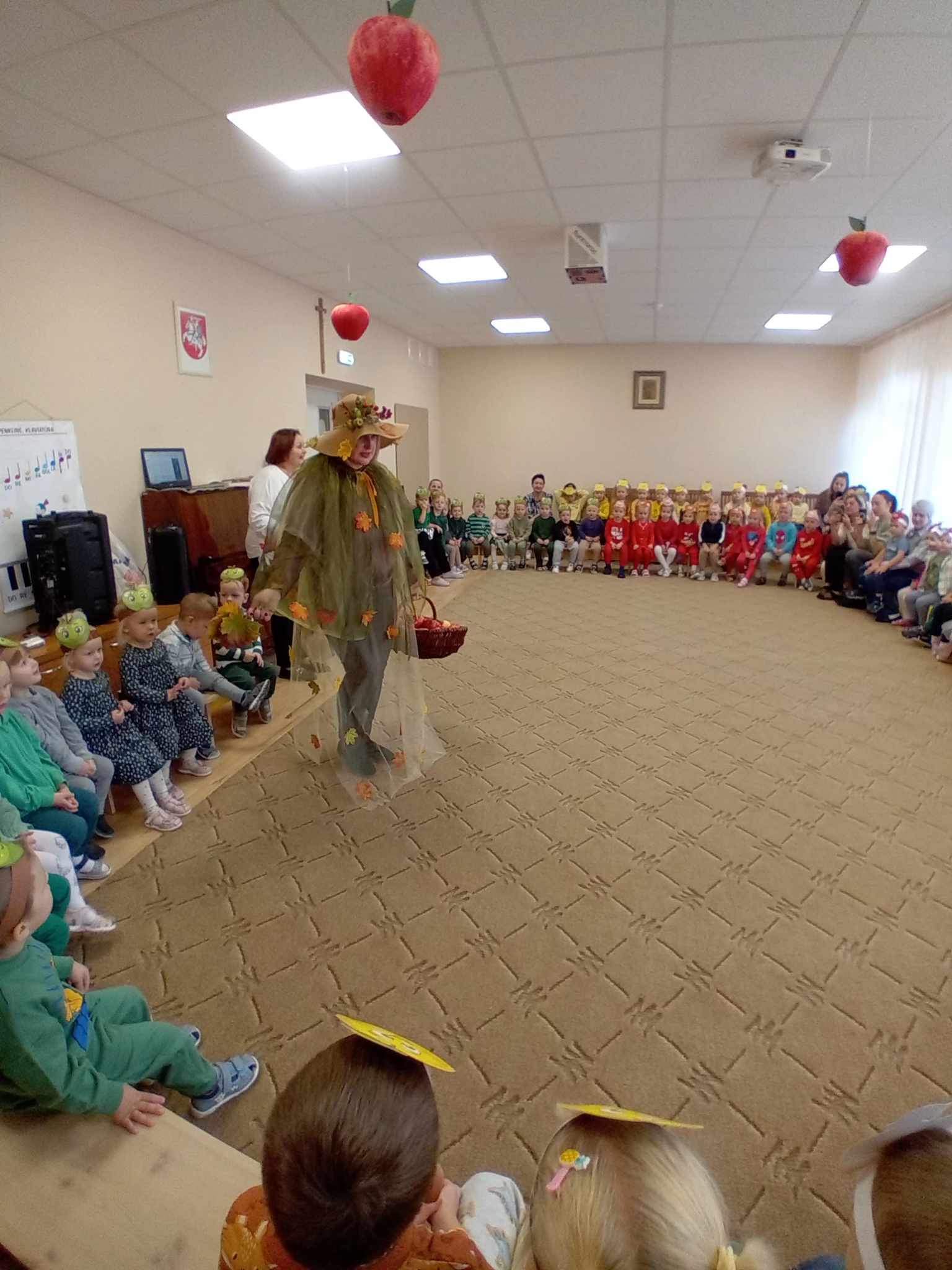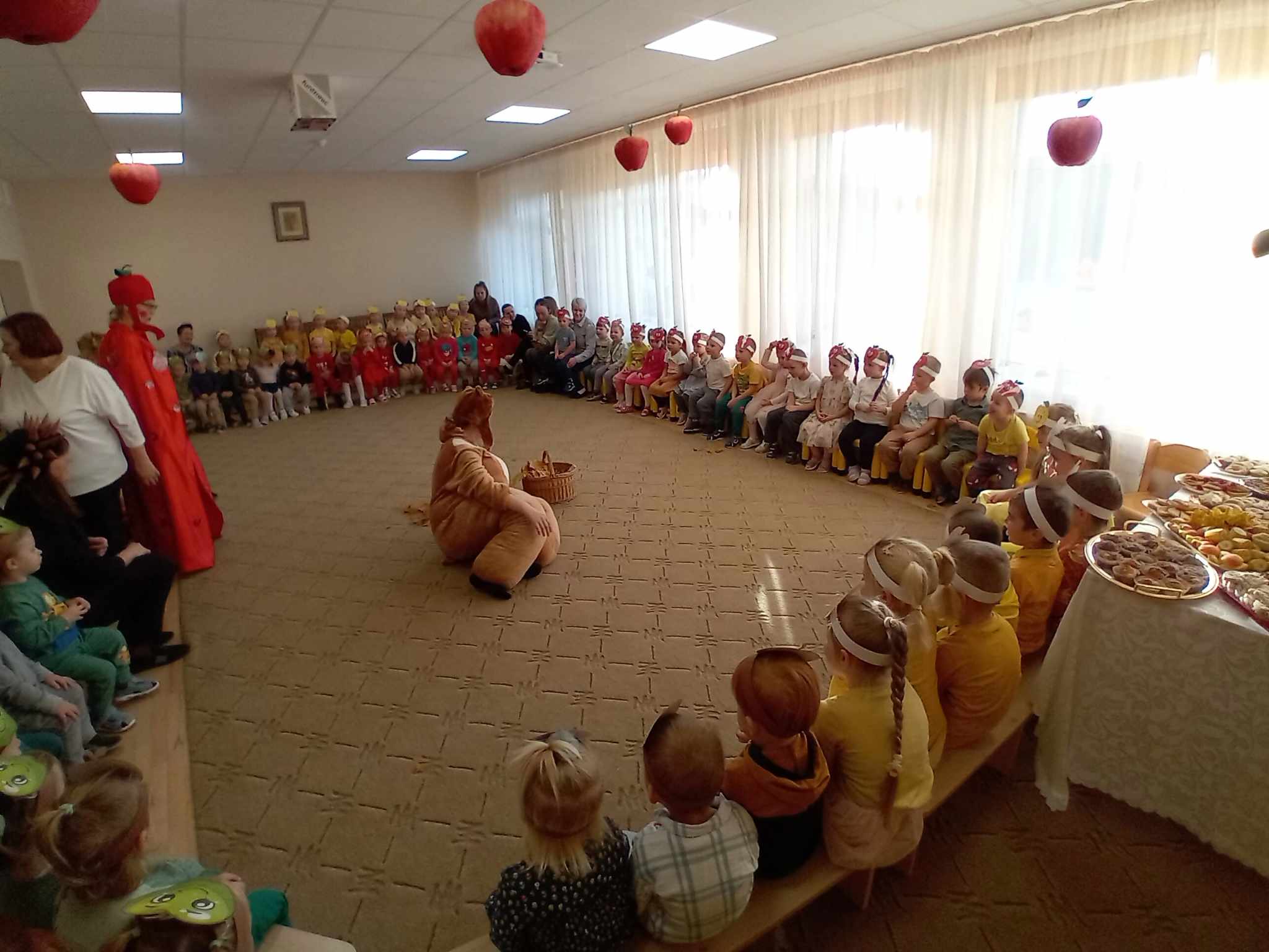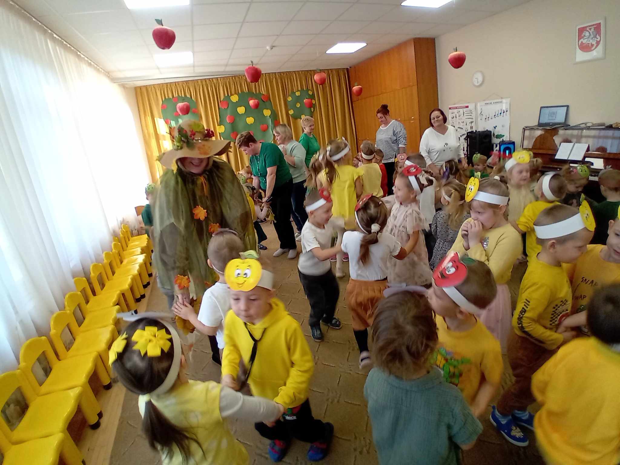 Žaidė įvairius žaidimus su obuoliais.  Jų metu pedagogai stengėsi  praturtinti vaikų žinias apie obuolį, jo populiarumą, turtingumą vitaminais, maistinėmis medžiagomis,  reikšmę žmogaus organizmui, skatino sveikai maitintis valgant kuo daugiau vaisių.